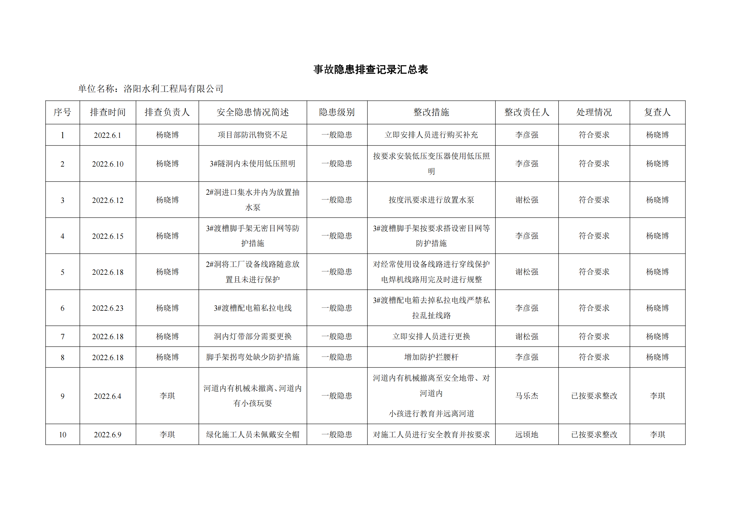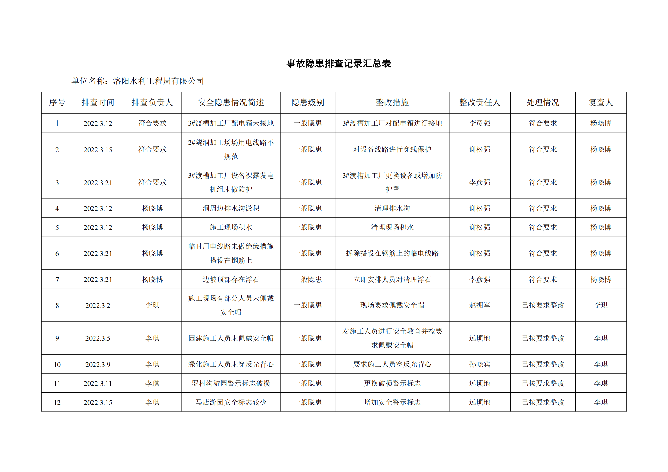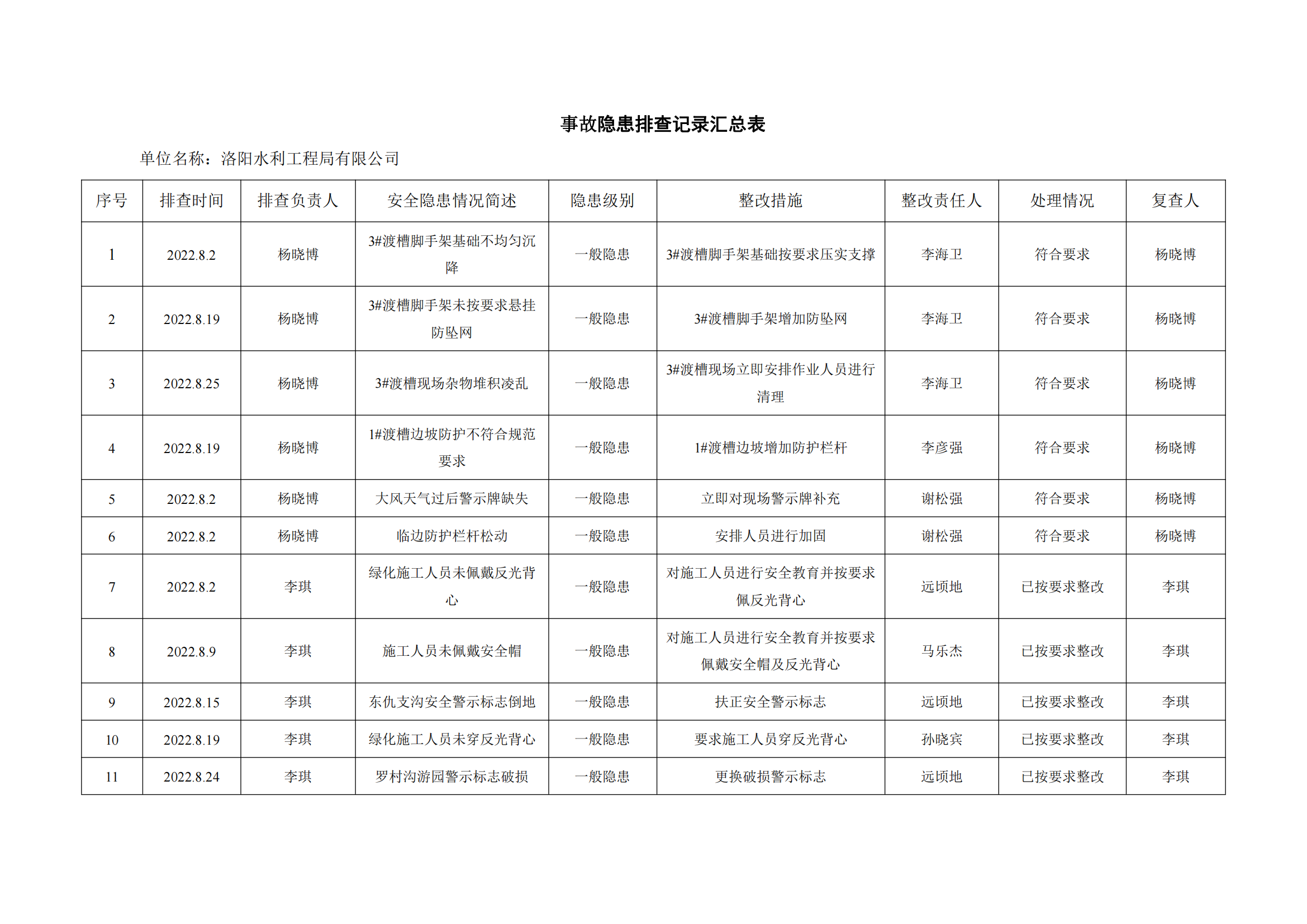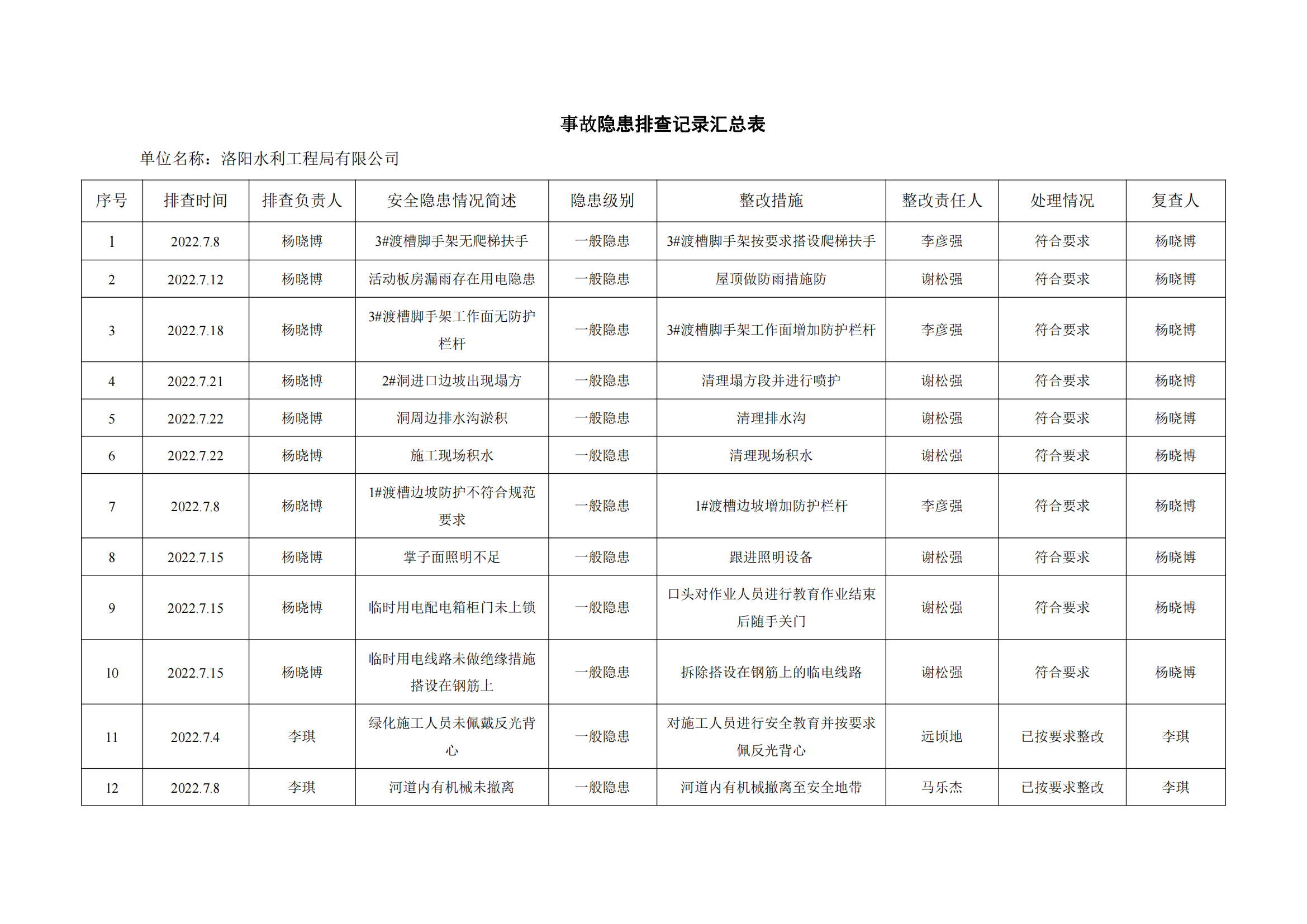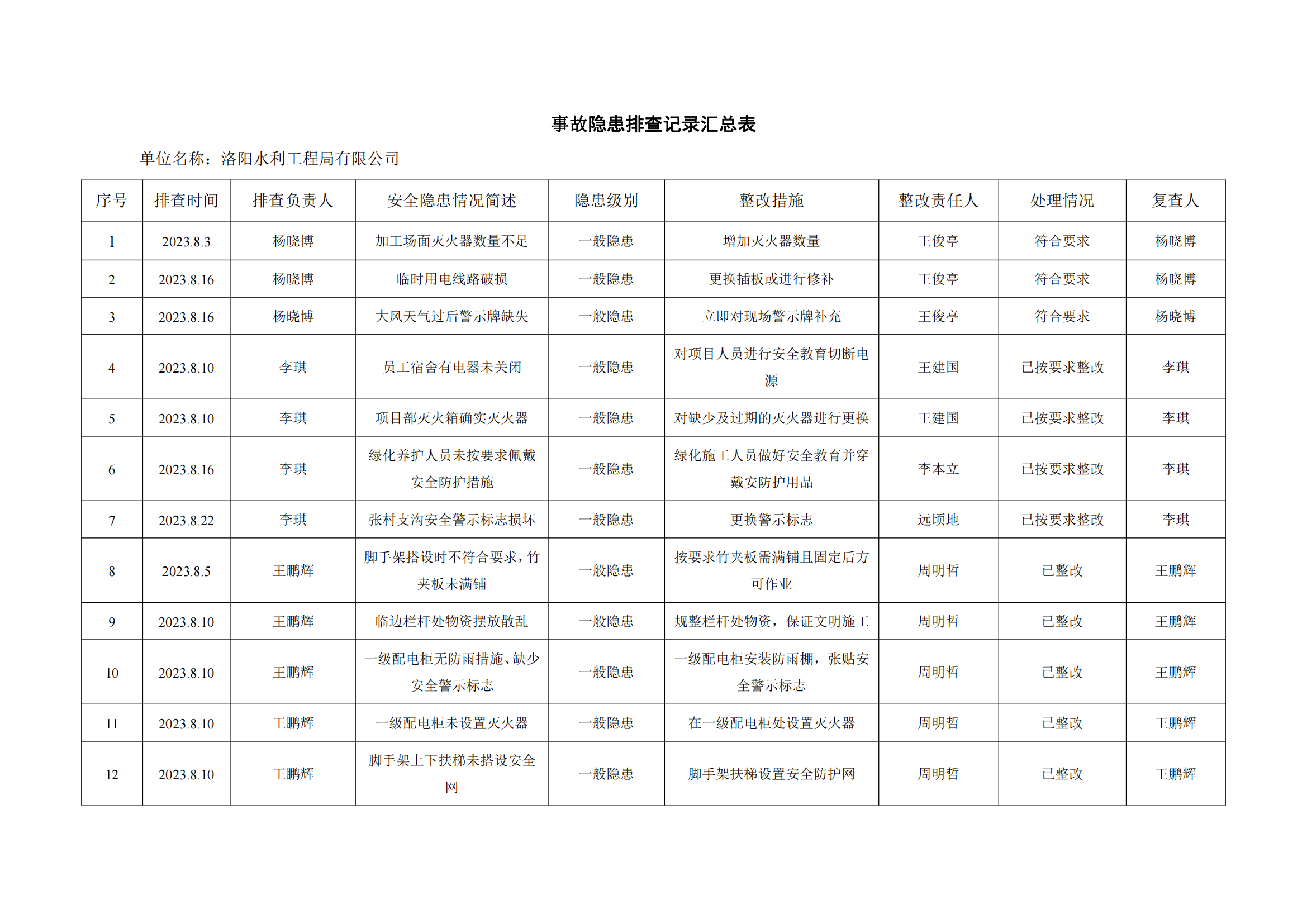 公司匯總事故隱患排查記錄匯總表