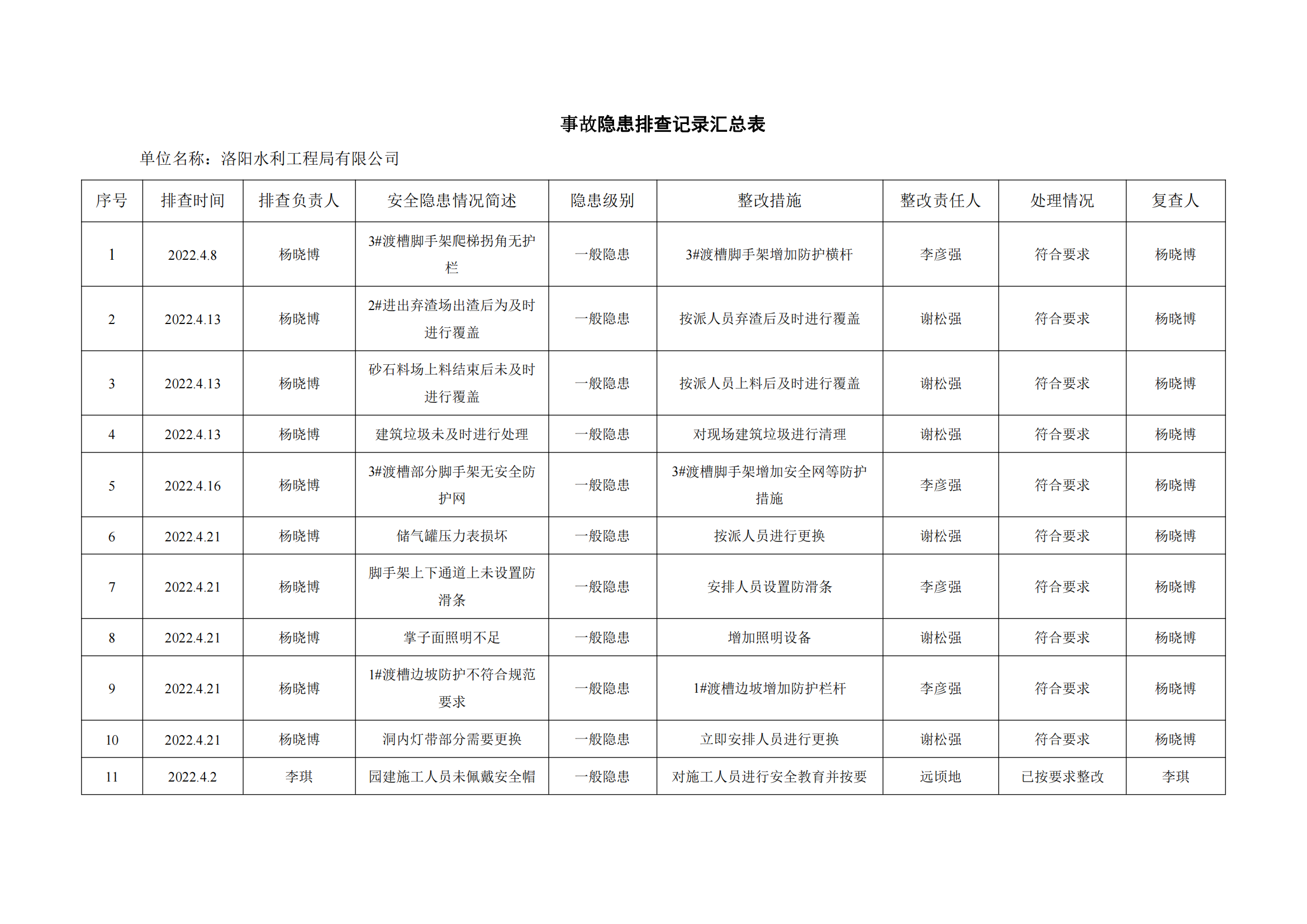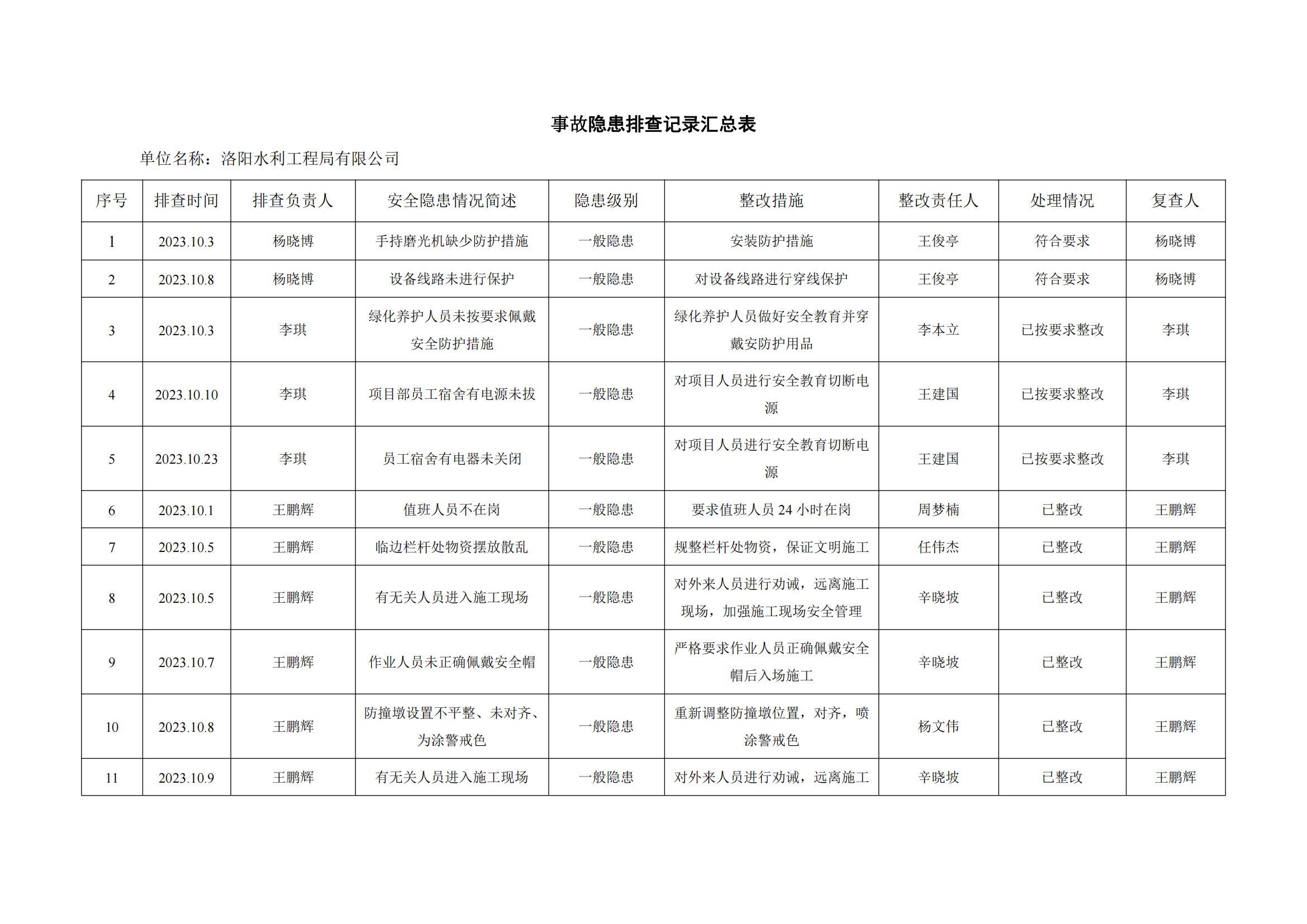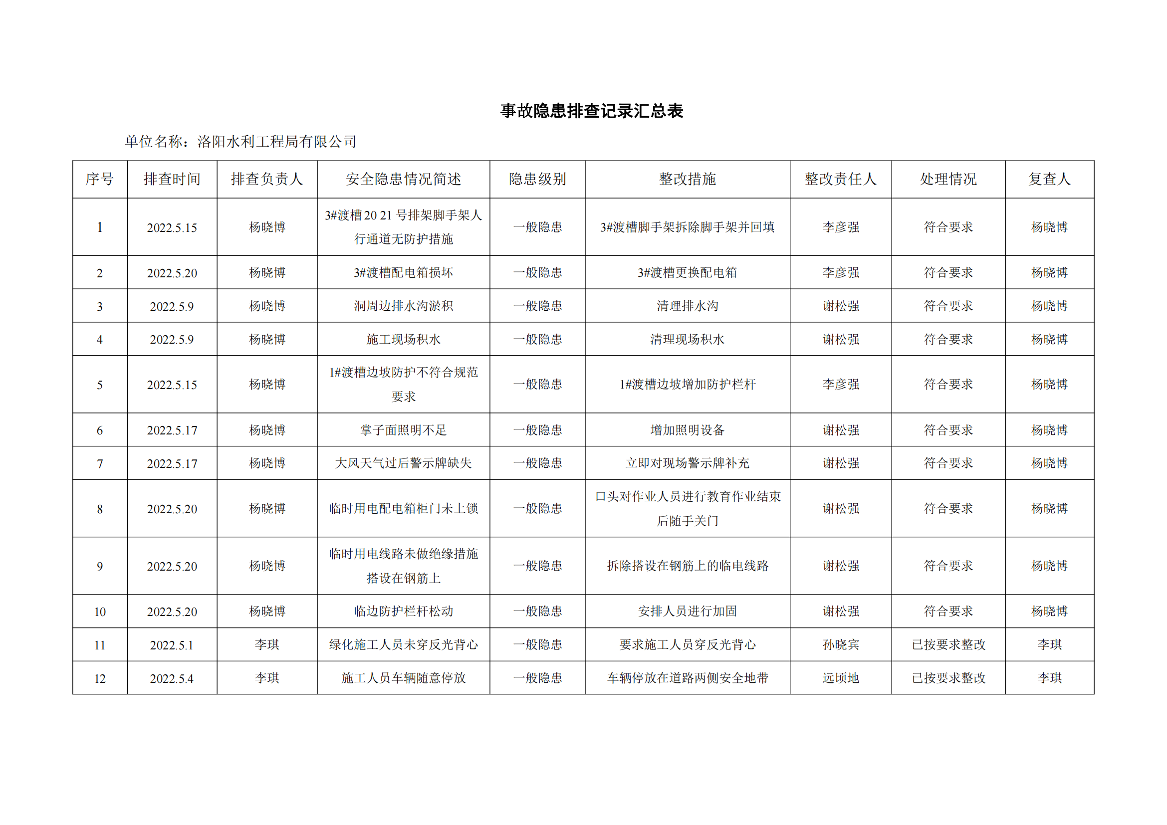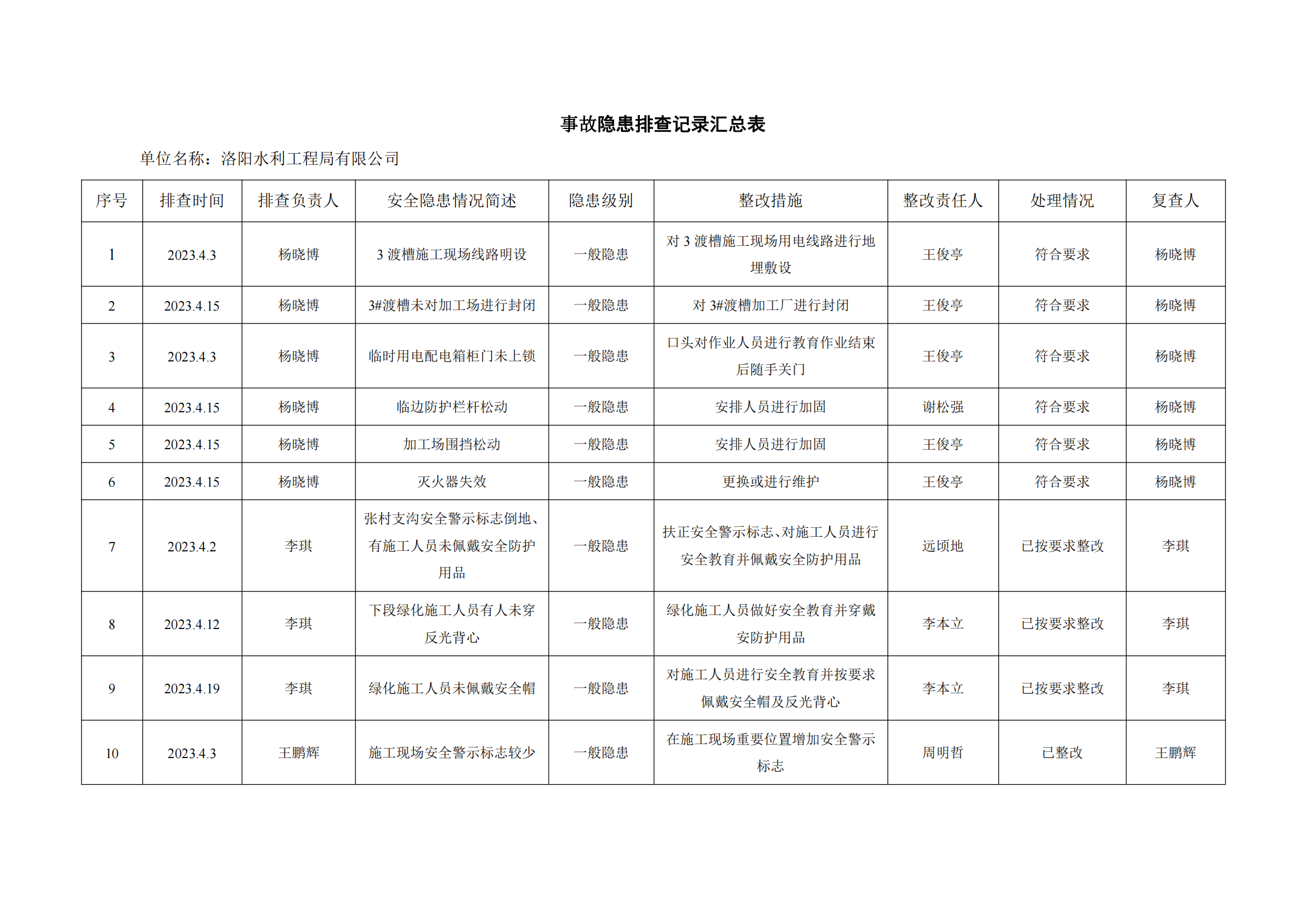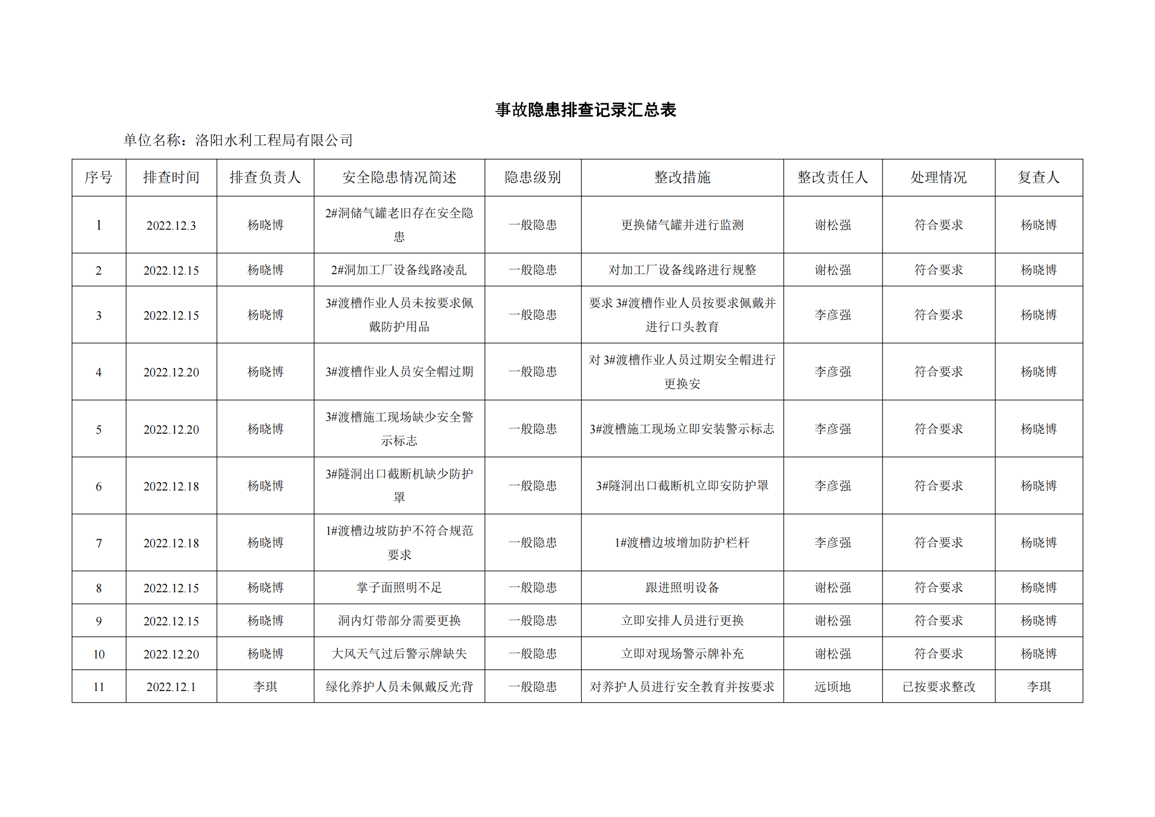 公司匯總事故隱患排查記錄匯總表