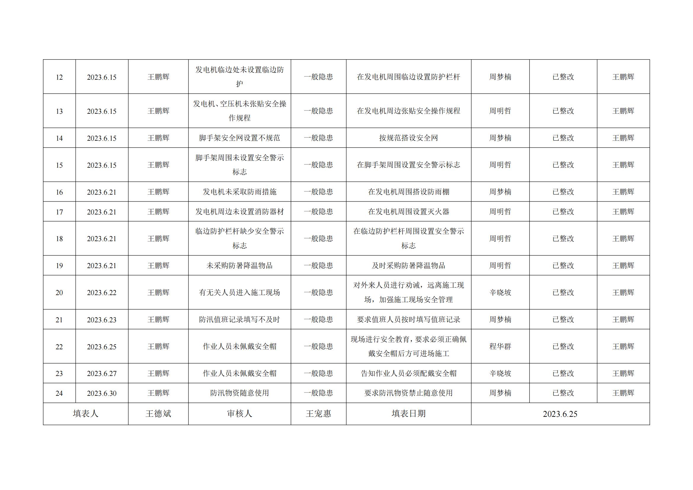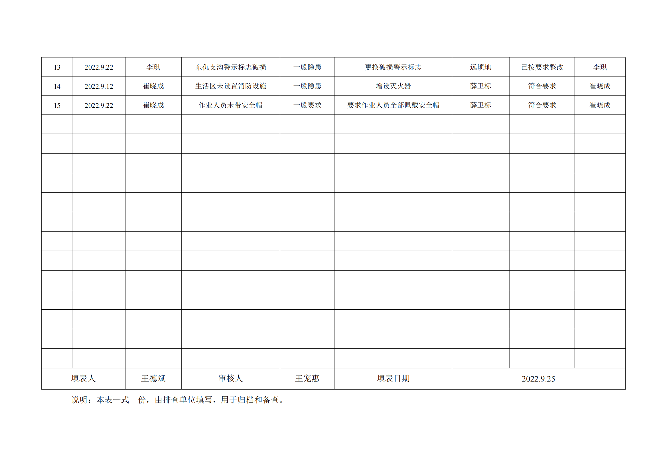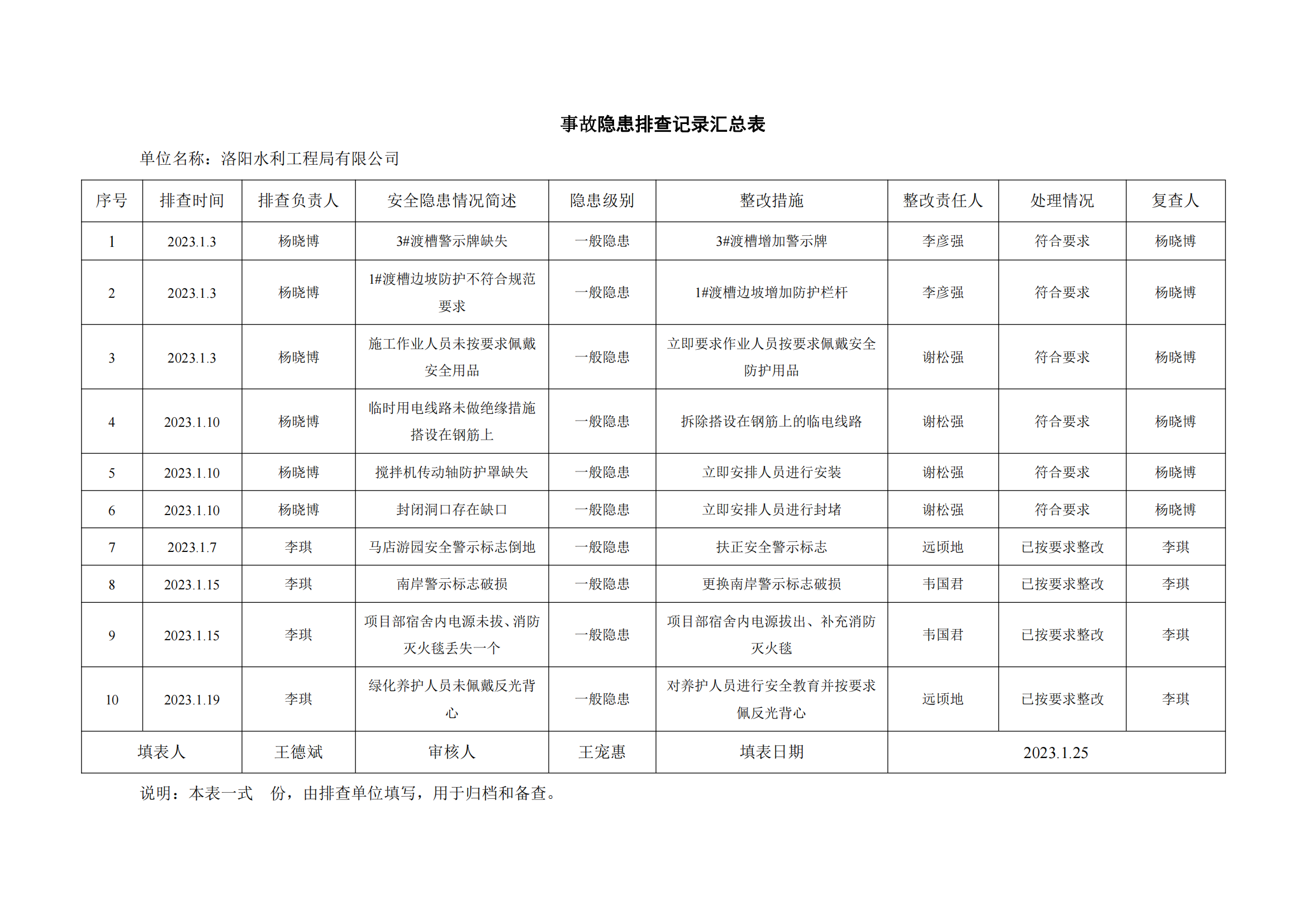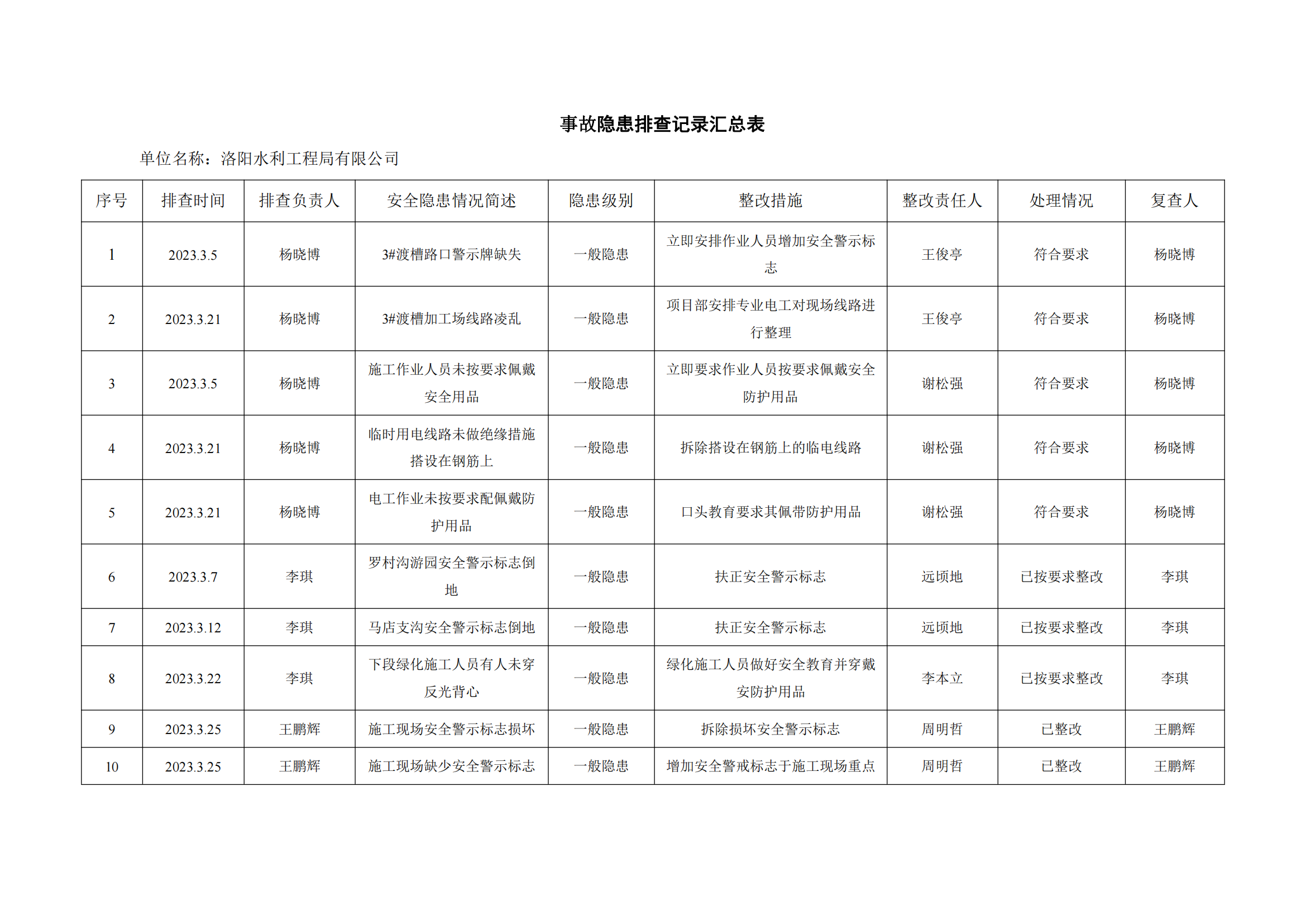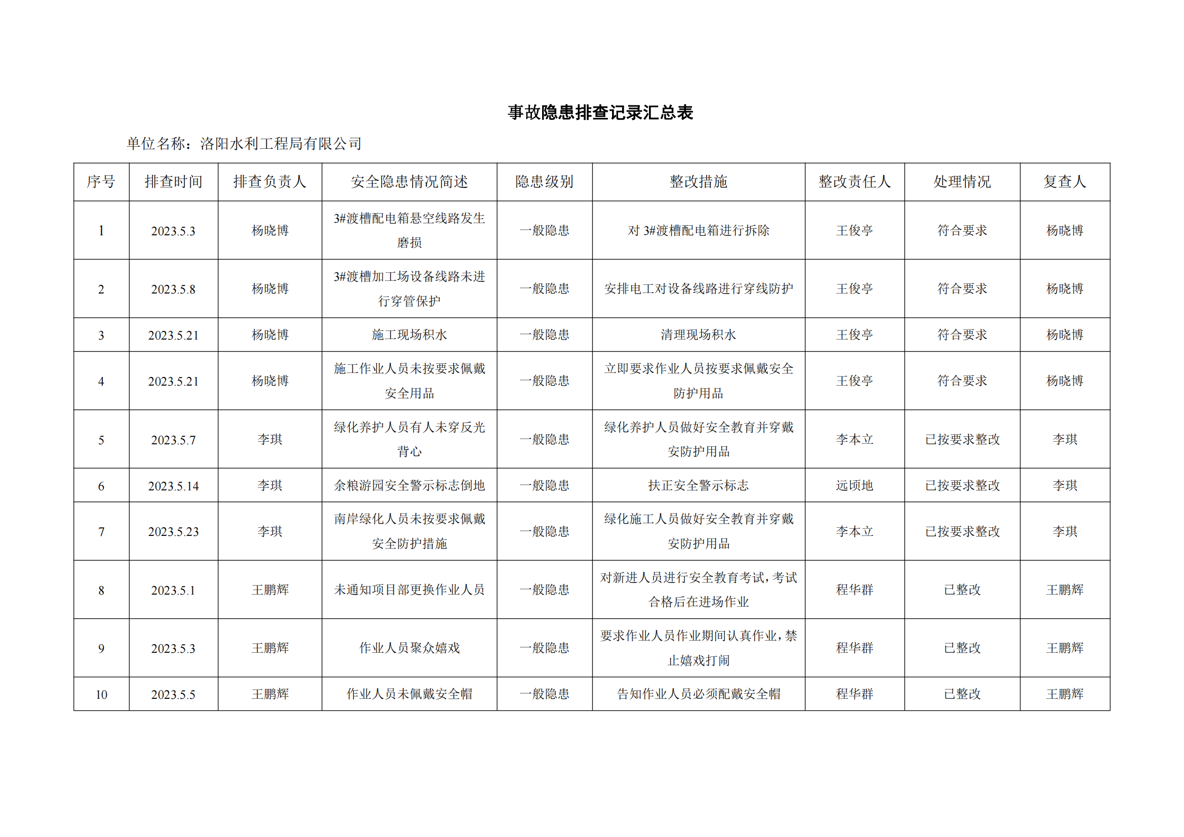 公司匯總事故隱患排查記錄匯總表